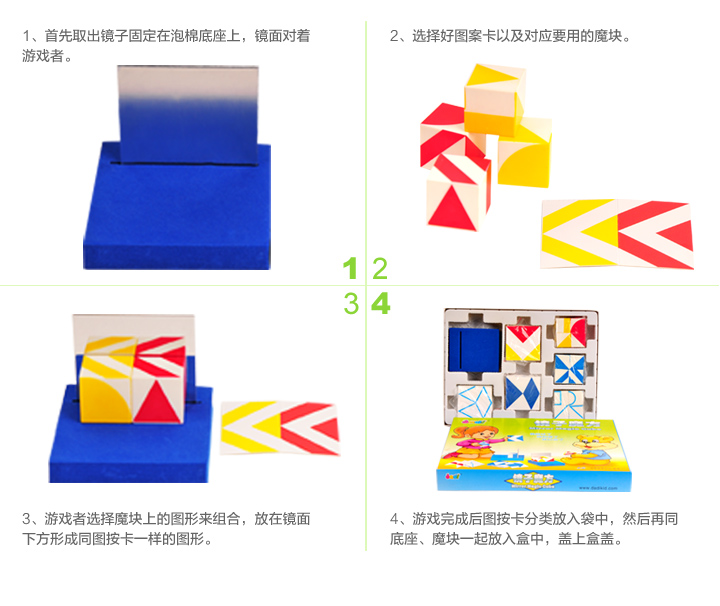 两人对(或并排)座,准备好镜子和魔块。游戏从拿出图案卡片开始,每个游戏者利用 2 块魔块和一面镜子来拼出卡片上的图案,较快拼出正确图案者就赢得这张卡片。最后,谁赢得的卡片较多,谁就赢得了这场游戏。