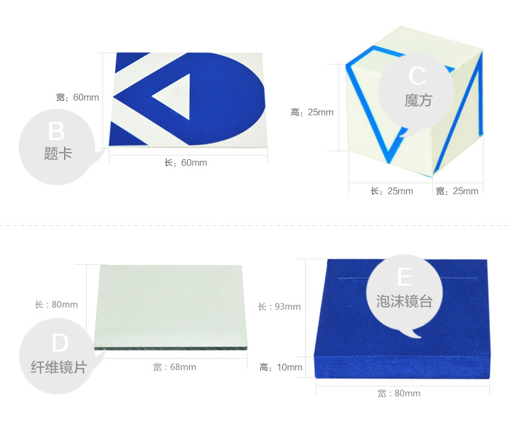 108张题卡——单色规则图形、双色规则图形、单色不规则图形三种类型循序渐进由浅入深!12个魔方——单色规格图形、双色规则图形、单色不规则图形对应相关题卡;2片纤维镜片,2块泡沫镜台。