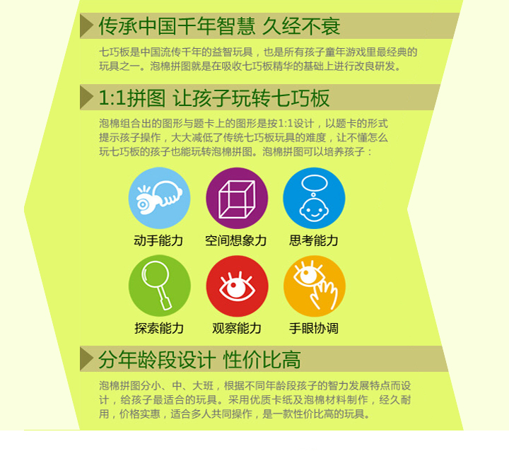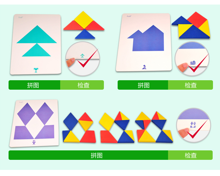 答:泡棉拼图利用三角形、四边形、多边形进行创意组合,既能充分锻炼孩子的手眼协调能力,又通过色彩、触感的刺激,开发孩子的创意,培养孩子求知的兴趣以及数学逻辑的思考。