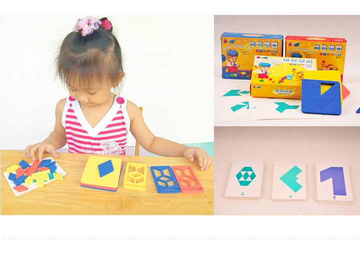 自己取出图案纸牌,放在面前,拿出几何泡棉,在图案框内拼出同图案一样的图形,完成后再取出另一张图案纸牌,再次操作即可。