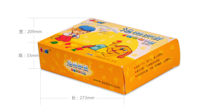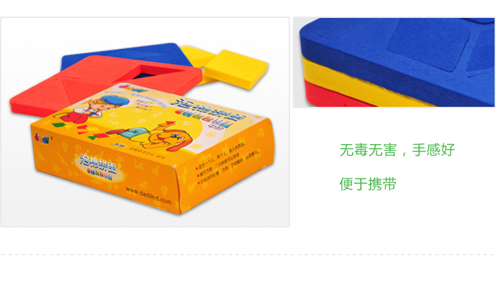 泡棉拼图游戏分有两种包装,其中一种包装里是无几何泡棉的,是专门为使用了《dadi数学》教材的幼儿设计的,由于《dadi数学》学具里已经包含了所用的几何泡棉,所以只需添加图案纸牌即可。