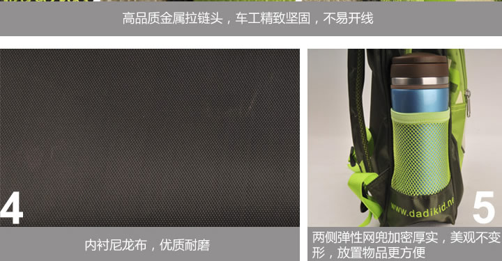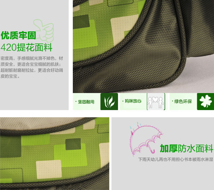 Q1 此款幼儿书包质量怎么样? 答:此款书包:护脊、环保、减压,专门为3-6岁幼儿设计。 ● 舒适:背部及肩带均采用内充珍珠棉材质工艺,更透气,更舒适,具备一定减压功能; ● 耐用:精心的工艺,标准学生双肩书包,采用密度高达50个丝的高级丝光面料缝制而成,耐磨结实,背带着力点采用了5处加固处理; ● 便利:捆条包边设计,使整个书包更硬挺,方便幼儿自己整理物品。书包两侧均有弧形立体网兜,可放置水壶、雨伞……,设计更方便; ● 精良:高品质拉链,拉链轨道畅通,拉链表面做工精美。