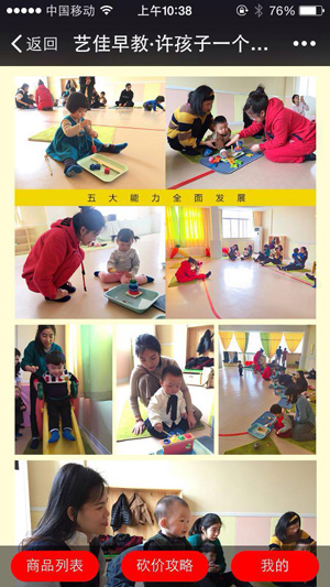 通过以上各种活动,已有四十多名宝宝成功报名艺佳早教,目前已正式开课,开设的母婴、启蒙课、全脑开发、音乐等丰富的亲子课程。优良的早教环境,专业的早教师资,赢得幼儿的喜爱,家长的一致认可。我们将继续努力,做专业的早教,帮助更好孩子健康成长,拥有良好的人生开端。